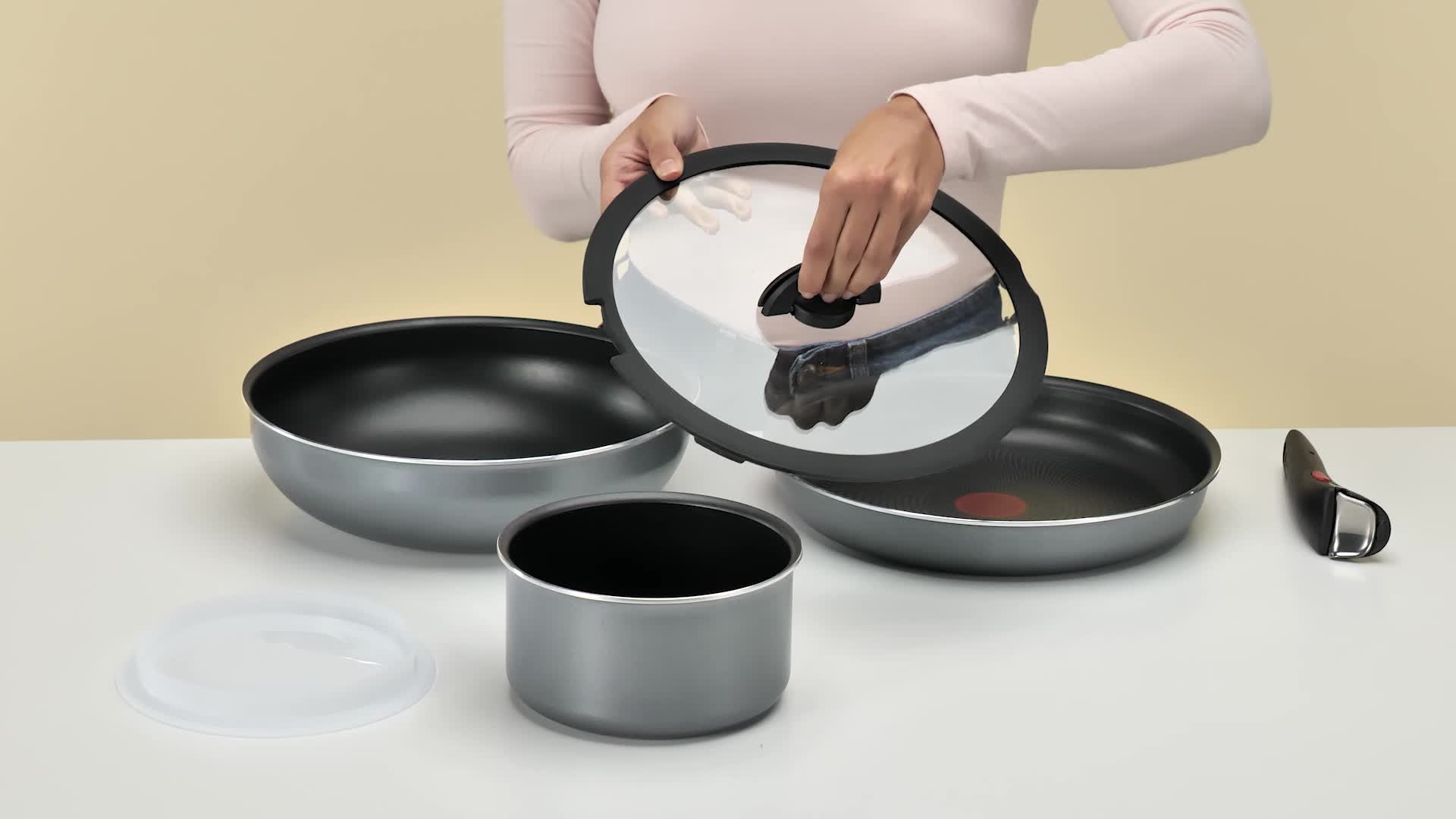 Batterie de cuisine polyvalente avec poignée amovible en un seul clic.
