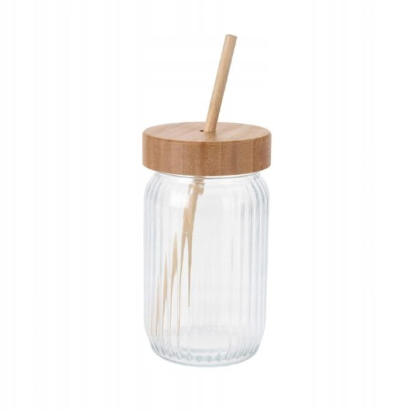 Bocal+ paille en verre transparent-500ml-couvercle en bois