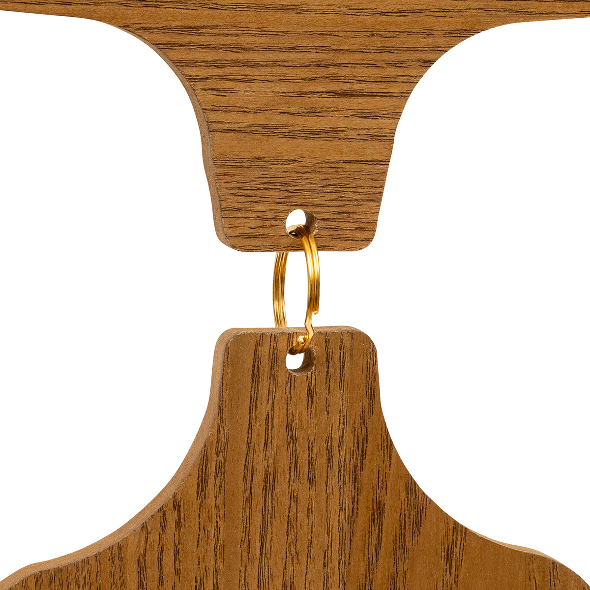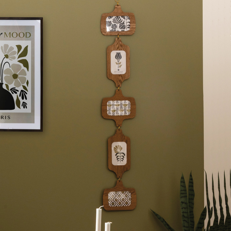 Composé de 5 cadres en bois aux angles arrondis, suspendus les uns aux autres par des attaches en métal doré, il se fixe au mur à la verticale.