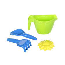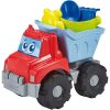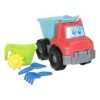 Sa benne articulée contient 4 accessoires : 1 arrosoir, 1 moule à sable, 1 pelle et 1 râteau.
