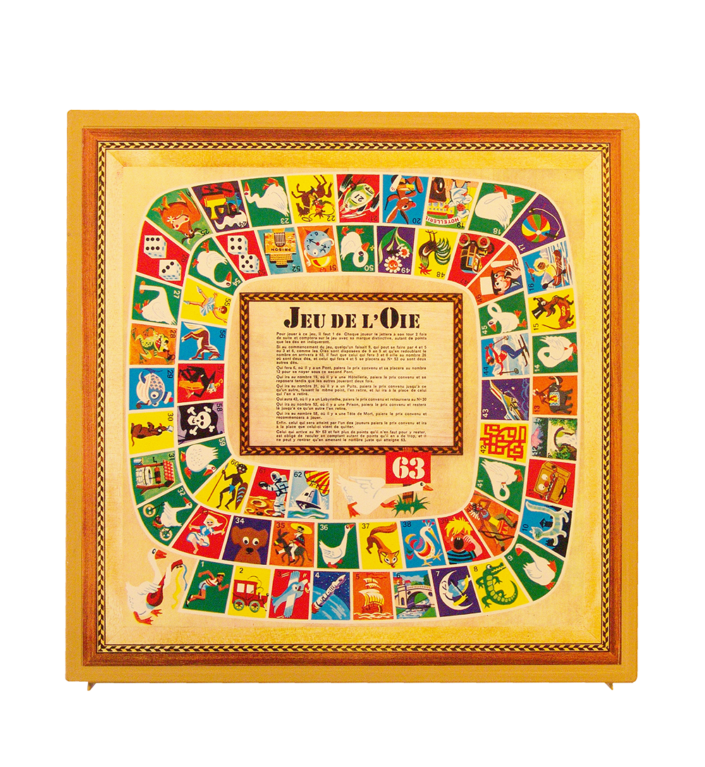 Ce coffret en plastique résistant présente les jeux de l’oie et de dada sur ses faces apparentes.