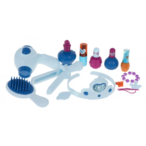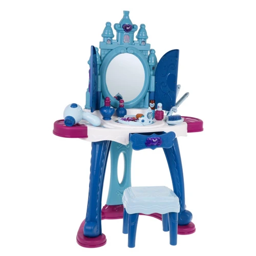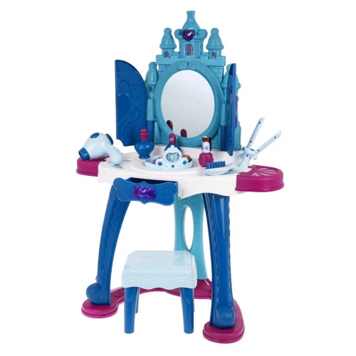 Coiffeuse interactive richement équipée avec effets lumineux et sonores pour les enfants dès 3 ans. Fabriquée en plastique de haute qualité aux couleurs vives, cette coiffeuse est dotée d’un grand plateau, d’un tiroir, d’étagères et d’un grand miroir ouvrant. Ce dernier émet des effets sonores, comme des mélodies joyeuses, et des effets lumineux. Un capteur situé au-dessus du miroir permet d’ouvrir et de fermer les portes magiques qui y donnent accès. Des figurines de princesses sont exposées sur le miroir. La coiffeuse est fournie avec un tabouret et de nombreux accessoires de maquillage. Elle fonctionne avec 3 piles AA 1,5 V (non incluses).