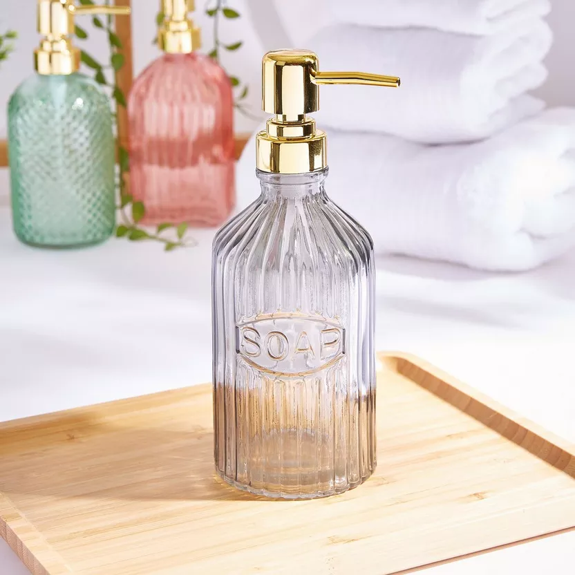 DISTRIBUTEUR DE SAVON LIQUIDE EN VERRE-450ML-POUSSOIR DORE-ASST