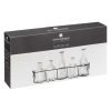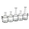 En forme de petites bouteilles en verre transparent soutenues par un socle en métal.