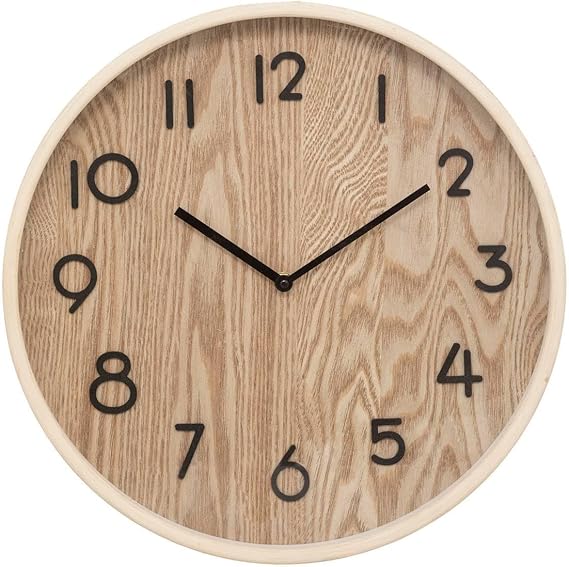 L’horloge « Ivana » arbore une forme classique et se distingue par son cadre en bois clair.