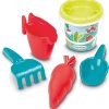 Ce chariot contient 1 seau décoré sur le thème des fruits et légumes, un tamis, un arrosoir, une pelle, un râteau et 1 moule à sable.