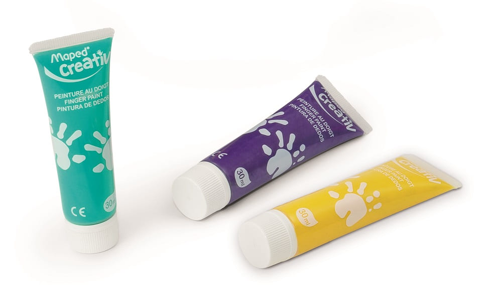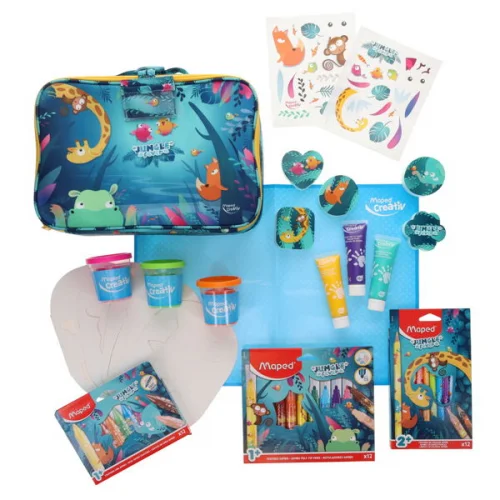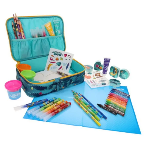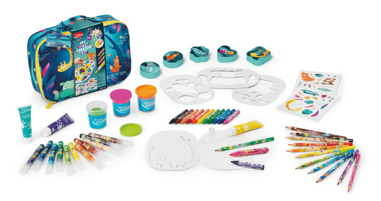 La valise contient également de la pâte à modeler, de la peinture au doigt, des stickers, des tampons et des fiches d’activités.