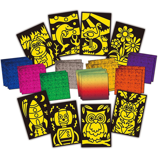 Créez 8 images scintillantes ! Décollez simplement une partie de l’image, placez la feuille métallisée sur la zone adhésive, frottez puis soulevez pour transférer la feuille métallisée scintillante sur votre image. Dimensions de l’image : 18 x 12,5 cm. Contient 25 feuilles métallisées de 8 couleurs assorties, 8 images et un guide. Convient aux enfants de 6 ans et plus.
