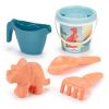 Plein d’accessoires amusants : 1 seau de 17 cm, 1 tamis, 1 arrosoir, 1 pelle, 1 râteau et 2 grands moulins à sable dinosaures.
