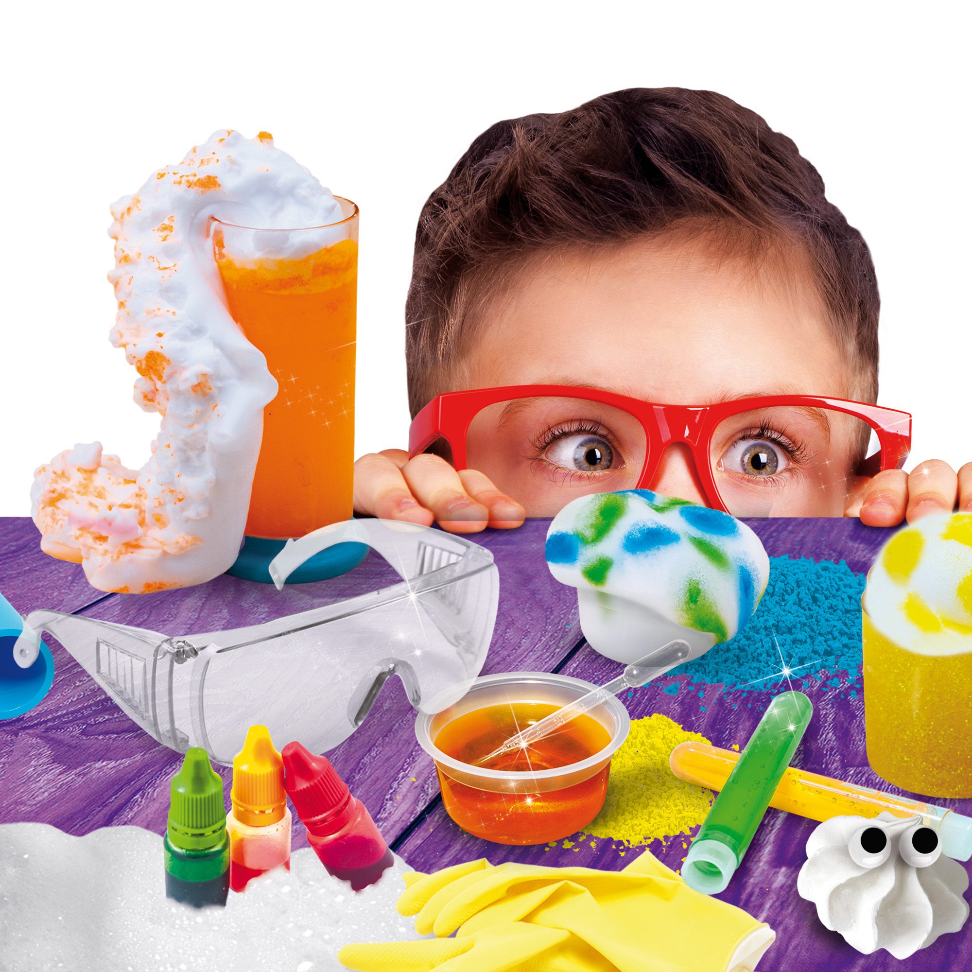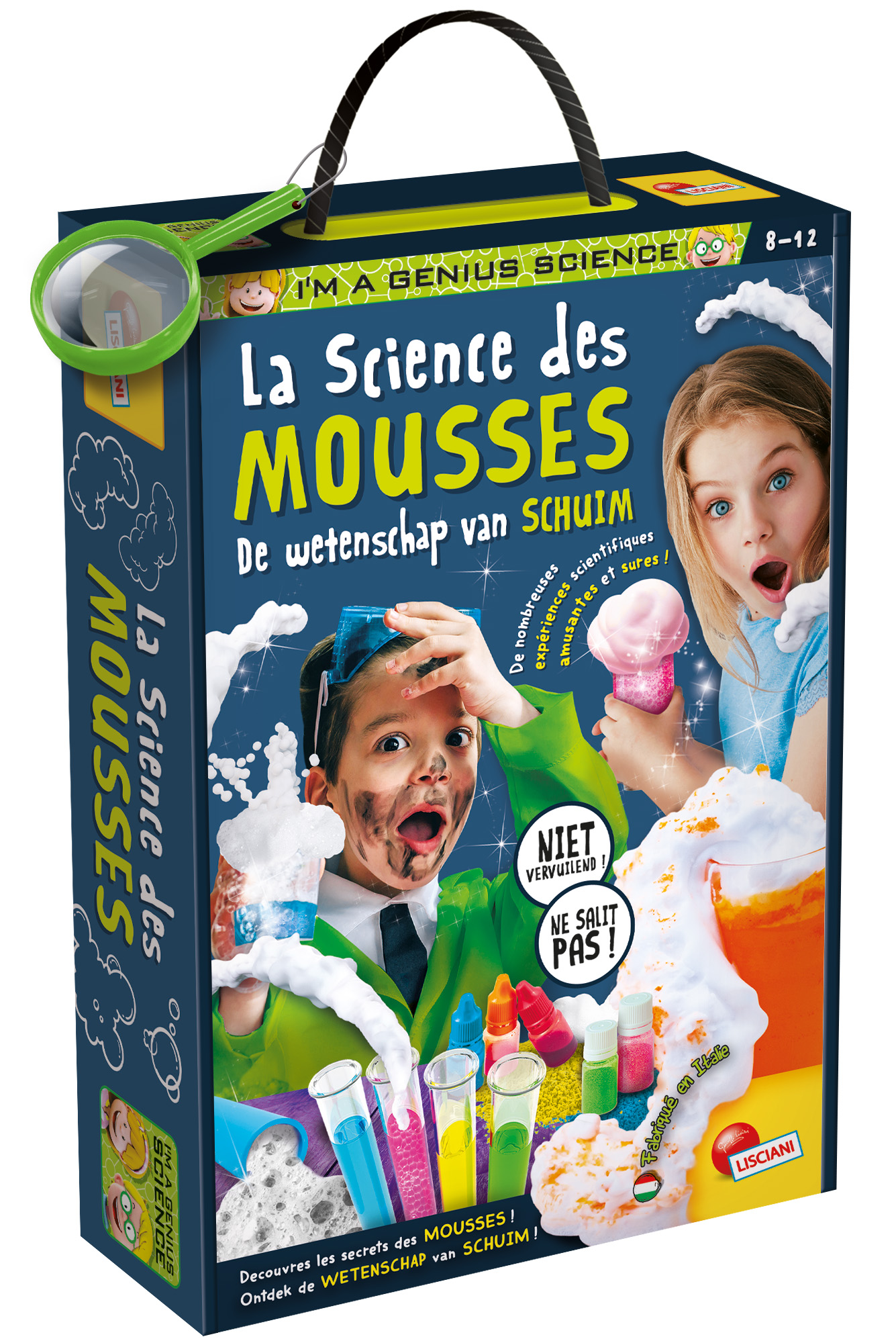 Un laboratoire scientifique unique au monde pour créer des substances moussantes surprenantes avec lesquelles on peut jouer et faire des expériences ! À l’intérieur de la boîte, il y a tout ce qu’il faut pour réaliser plus de 15 types de mousses et pour construire un véritable PISTOLET À MOUSSE !