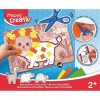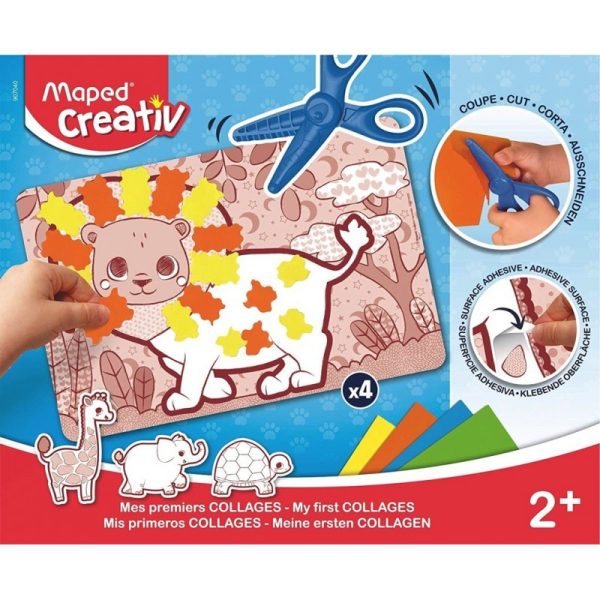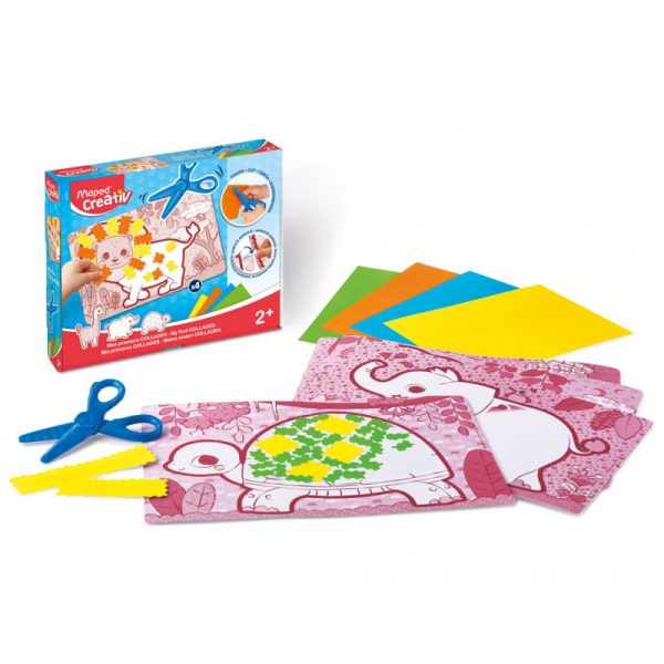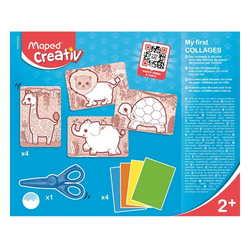 Ce kit Maped Creativ permet à bébé de réaliser ses premiers collages : décorer des animaux avec des bandes de papier découpées avec des ciseaux de sécurité.