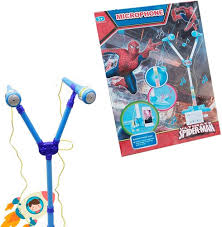 Le microphone Spiderman en plastique se compose de deux microphones, de trois tiges et de trois pieds servant de base pour le fixer au sol. Il fonctionne sur piles et s’active par un bouton pour déclencher des effets lumineux et musicaux.