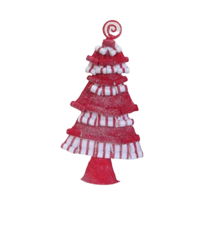 Un sapin décoratif rouge et blanc aux allures de friandise, orné de paillettes et de volants façon sucre d’orge.
