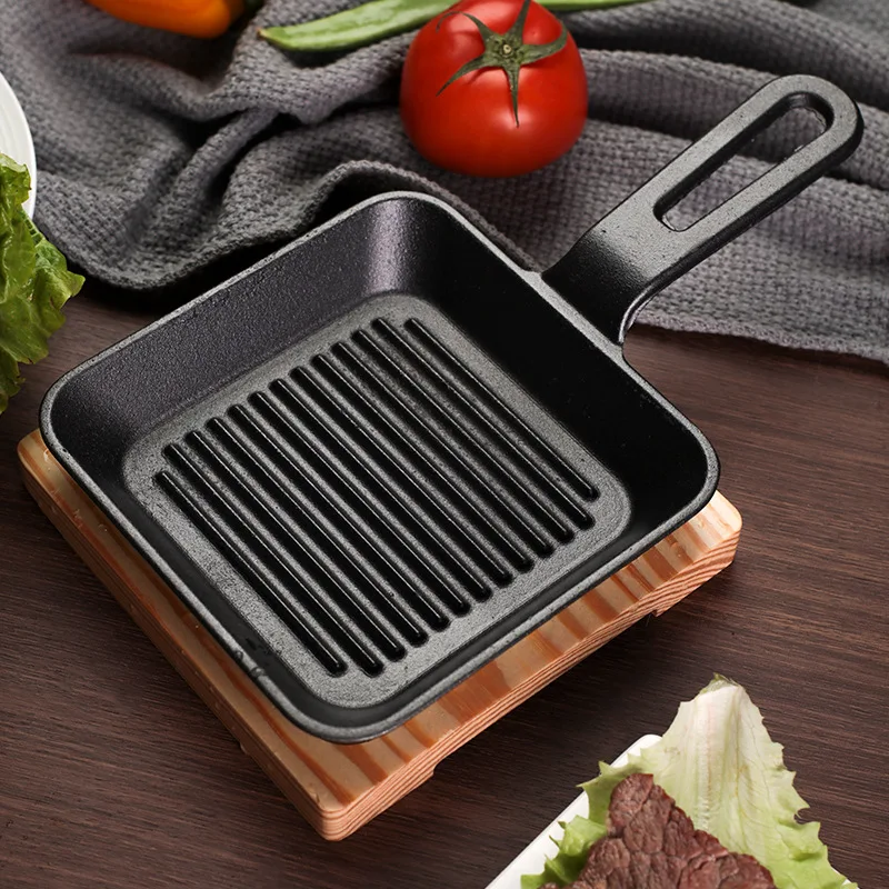 PLAQUE DE CUISSON EN FONTE-CARRE-16CM-AVEC MANCHE+SOCLE EN BOIS