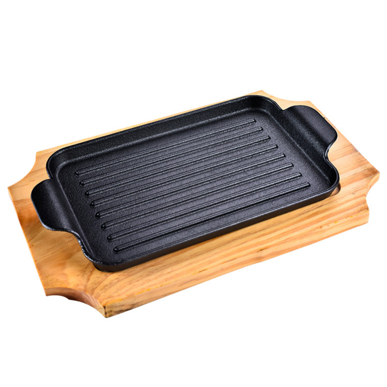 PLAQUE DE CUISSON EN FONTE RECT-26X17CM-MANCHES+SOCLE EN BOIS