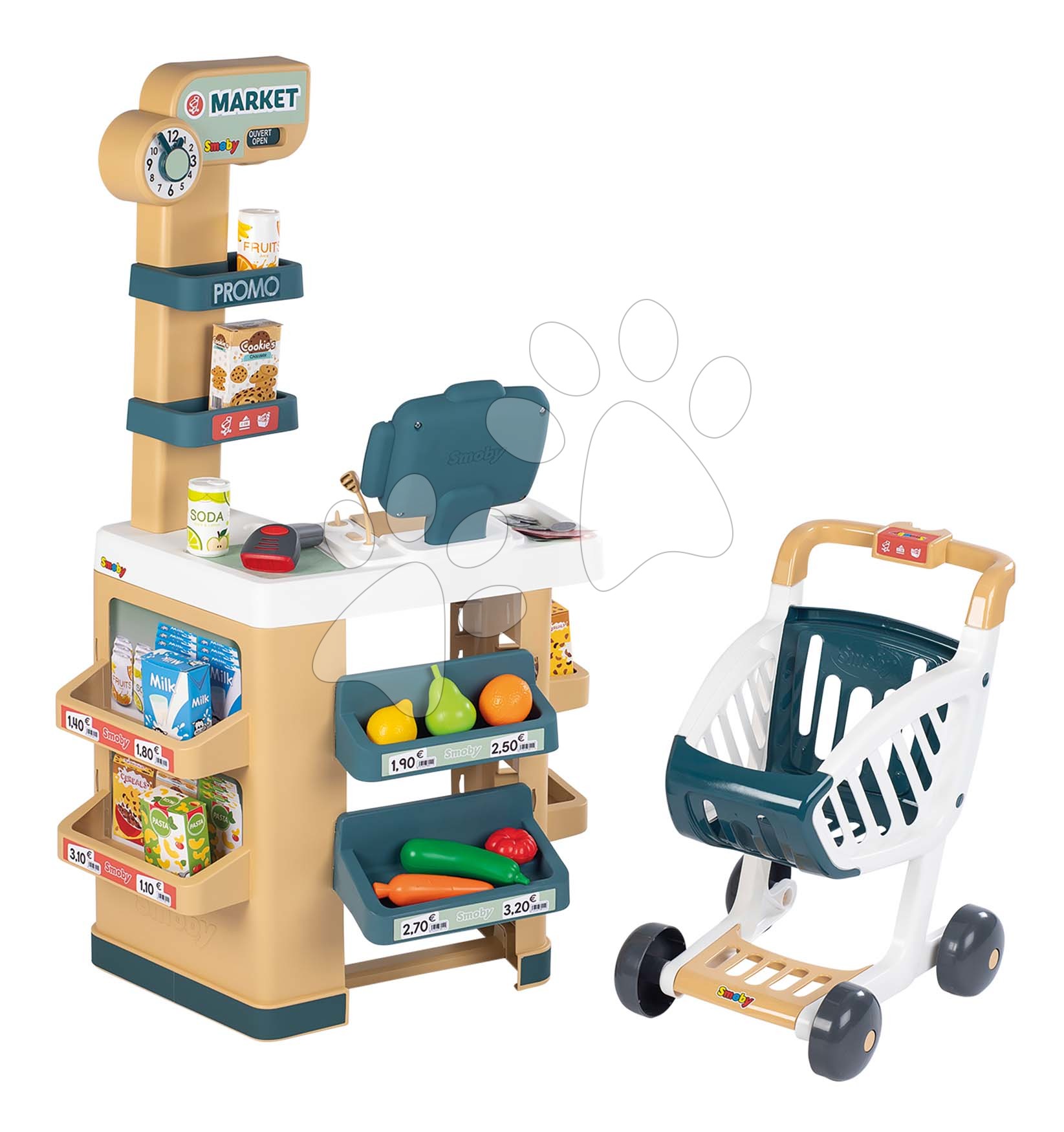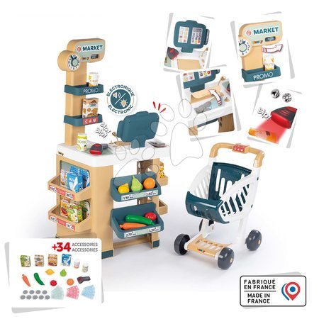 Le magasin avec caisse Market du fabricant français Smoby représente un excellent jouet pour les garçons et les filles à partir de 3 ans. Le petit magasin est fabriqué dans des couleurs pastel agréables, lui donnant un aspect original, et il embellira chaque chambre d’enfant. Le magasin pour enfants est équipé d’un scanner avec lumière et son, qui s’illumine et émet des sons lorsque l’on appuie sur un bouton.