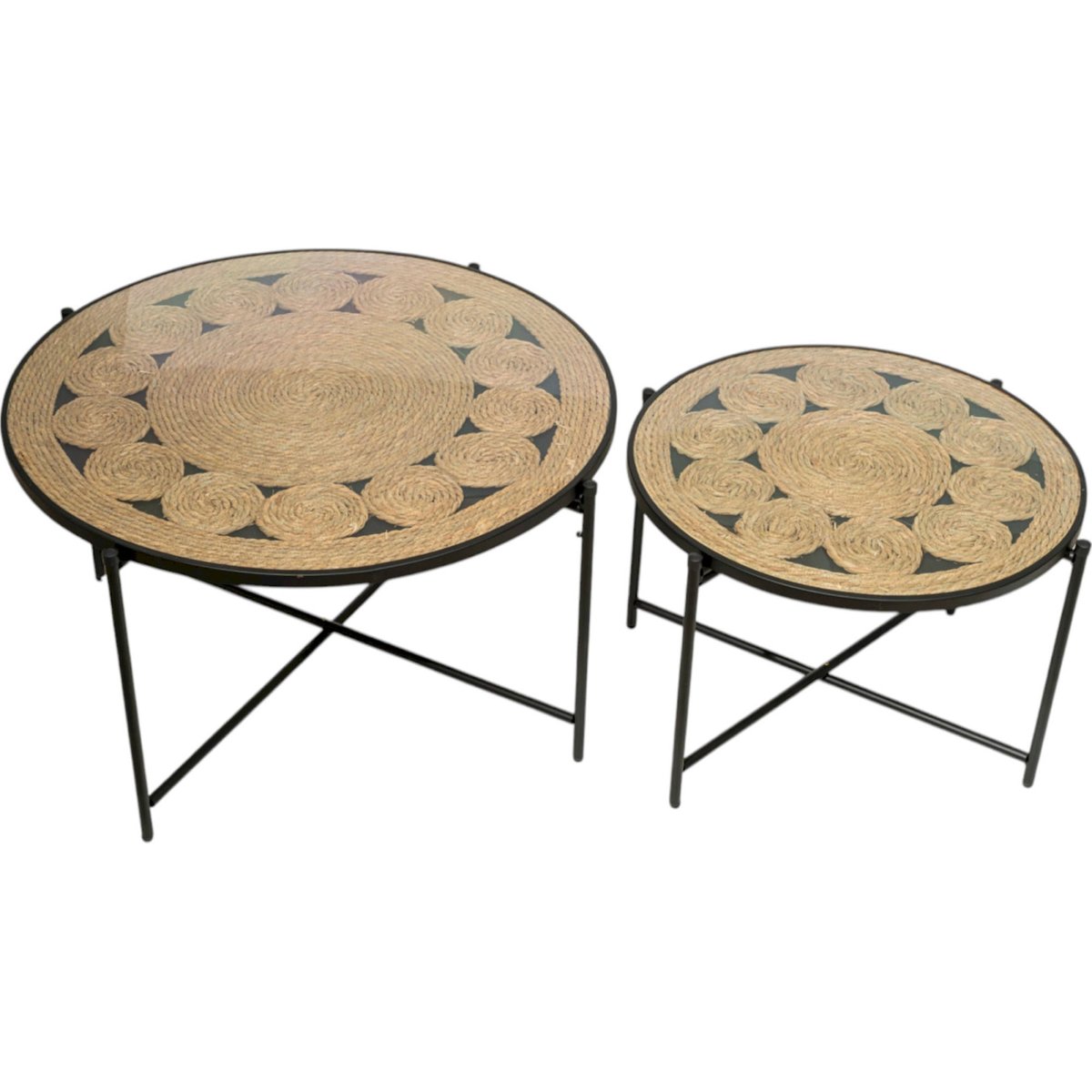 Table basse set de 2 rond-80x47cm/60x42cm-sur socle métal plateaux plexi/rotin