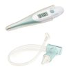 • 9 accessoires essentiels pour prendre soin de bébé : un thermomètre digital avec embout souple, un mouche bébé par aspiration buccale (avec réservoir anti-retour de sécrétions), une paire de ciseaux à bout arrondi, un coupe ongle, une lime à ongle, un thermomètre de bain, une brosse douce, un anneau de dentition réfrigérable et un masseur de gencives.