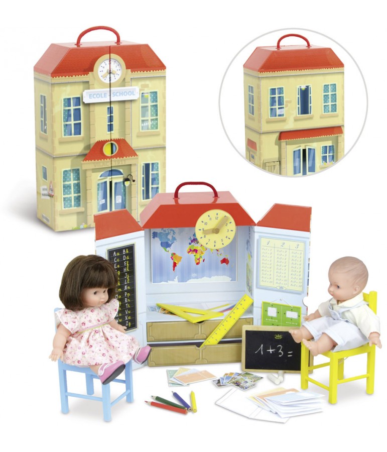 Prenez vos carnets de correspondance ! », « Interrogation surprise ! »… Les enfants vont devenir de véritables maîtres et maîtresses d’école grâce à cette école en valise. Accessoires en bois, chaises pour asseoir ses poupées, cahiers et crayons.