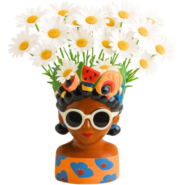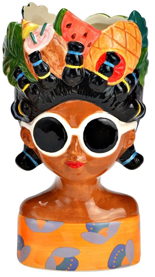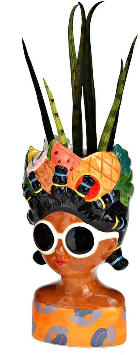 Donnez à votre intérieur une touche unique et artistique avec ce superbe pot de fleurs/vase en forme de tête de femme tenant des fruits tropicaux.