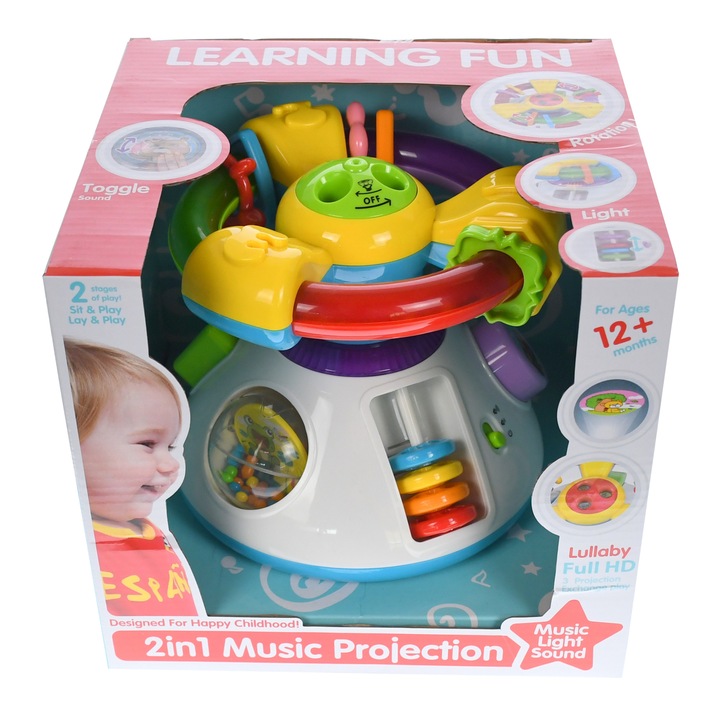 Ce jouet multifonctionnel peut être d’une grande aide aux parents, permettant d’occuper l’enfant durant la journée et de l’apaiser avant le coucher grâce à des lumières, des berceuses et des images de dessins animés projetées au plafond.