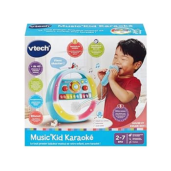 Le Musickid Karaoké bleu de Vtech propose 40 chansons, 4 modes d’écoute et enregistrement, karaoké avec déformation de la voix, prise casque et connexion Bluetooth.